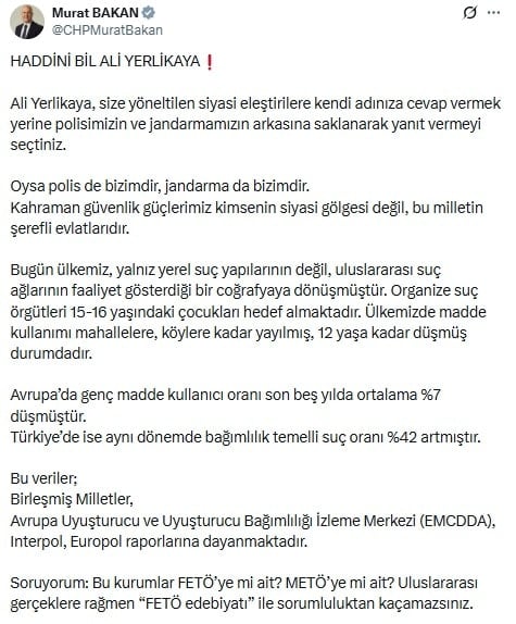 Murat Bakan, paylaşımında İçişleri Bakanı’nın, muhalefetin yönelttiği siyasi sorulara kendi adına cevap vermek yerine “polisi ve jandarmayı siper aldığı” iddiasında bulundu. Güvenlik birimlerinin, hiçbir siyasi tartışmanın tarafı olamayacağını vurgulayan Bakan, “Kahraman güvenlik güçlerimiz bu milletin şerefli evlatlarıdır; kimsenin siyasi gölgesi değildir” ifadelerini kullandı.