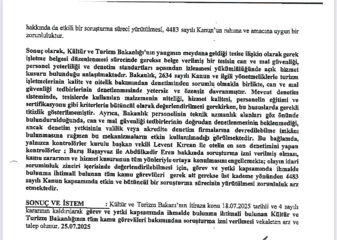 Danıştay 1. Daire Başkanlığı, Bolu Kartalkaya’daki Grand Kartal Otel’deki 78 kişinin hayatını kaybettiği yangında sorumluluğu bulunan Kültür ve Turizm Bakanlığı yetkilileriyle ilgili karar verdi.