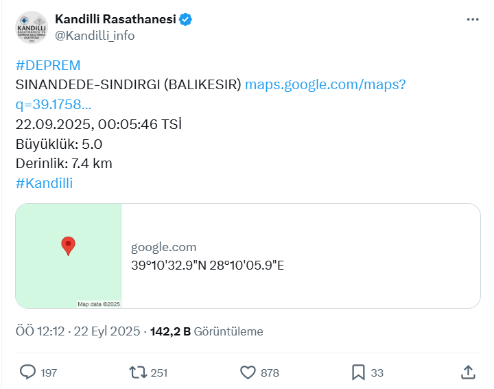 Kandilli Rasathanesi, Balıkesir’in Sındırgı ilçesinde bir deprem meydana geldiğini açıkladı. Depremin büyüklüğü 5.0 olarak ölçüldü.